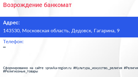 Возрождение, банкомат по адресу 143530, Московская область, Дедовск, Гагарина, 9 в дальнейшем Организация, размещена в следующих категориях: