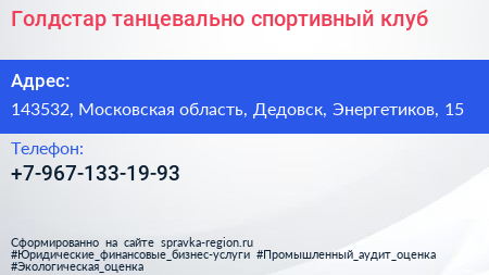 Голдстар, танцевально-спортивный клуб по адресу 143532, Московская область, Дедовск, Энергетиков, 15 в дальнейшем Организация, размещена в следующих категориях: