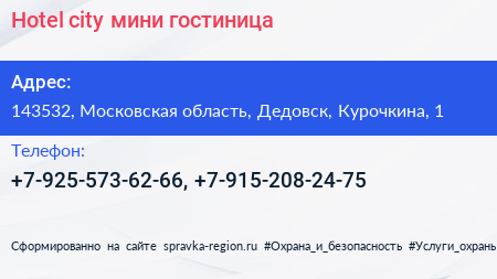 Hotel-city, мини-гостиница по адресу 143532, Московская область, Дедовск, Курочкина, 1 в дальнейшем Организация, размещена в следующих категориях: