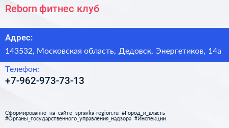 Reborn, фитнес-клуб по адресу 143532, Московская область, Дедовск, Энергетиков, 14а в дальнейшем Организация, размещена в следующих категориях: