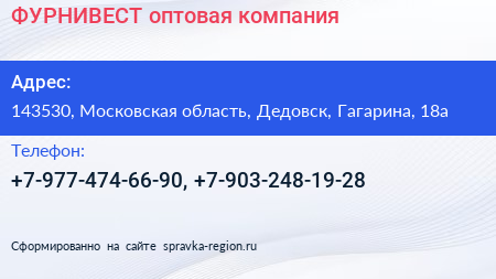 ФУРНИВЕСТ, оптовая компания по адресу 143530, Московская область, Дедовск, Гагарина, 18а в дальнейшем Организация, размещена в следующих категориях: