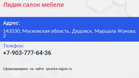 Лидия, салон мебели по адресу 143530, Московская область, Дедовск, Маршала Жукова, 2 в дальнейшем Организация, размещена в следующих категориях: