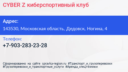 CYBER Z, киберспортивный клуб по адресу 143530, Московская область, Дедовск, Ногина, 4 в дальнейшем Организация, размещена в следующих категориях: