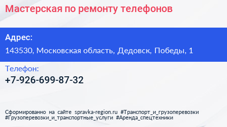 Мастерская по ремонту телефонов по адресу 143530, Московская область, Дедовск, Победы, 1 в дальнейшем Организация, размещена в следующих категориях: