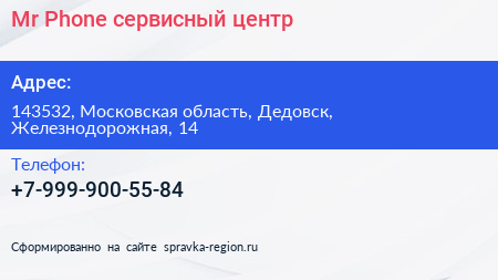 Mr.Phone, сервисный центр по адресу 143532, Московская область, Дедовск, Железнодорожная, 14 в дальнейшем Организация, размещена в следующих категориях: