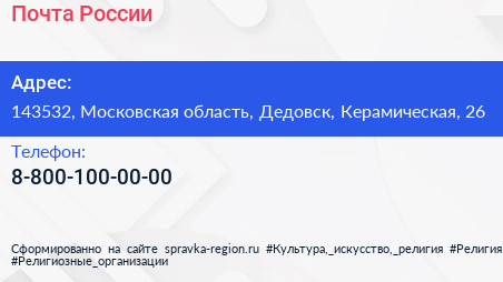 Почта России по адресу 143532, Московская область, Дедовск, Керамическая, 26 в дальнейшем Организация, размещена в следующих категориях: