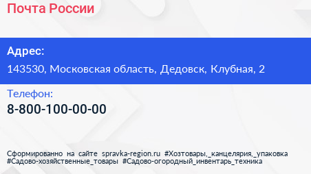 Почта России по адресу 143530, Московская область, Дедовск, Клубная, 2 в дальнейшем Организация, размещена в следующих категориях: