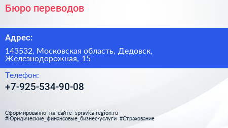 Бюро переводов по адресу 143532, Московская область, Дедовск, Железнодорожная, 15 в дальнейшем Организация, размещена в следующих категориях: