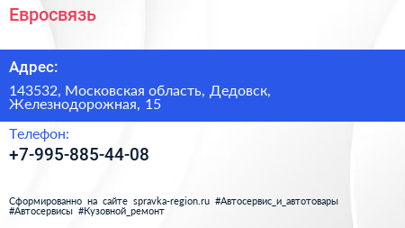 Евросвязь по адресу 143532, Московская область, Дедовск, Железнодорожная, 15 в дальнейшем Организация, размещена в следующих категориях:
