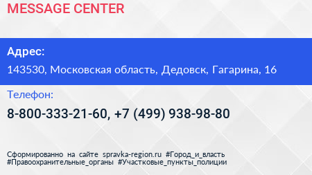 MESSAGE CENTER по адресу 143530, Московская область, Дедовск, Гагарина, 16 в дальнейшем Организация, размещена в следующих категориях: