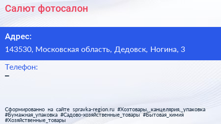 Салют, фотосалон по адресу 143530, Московская область, Дедовск, Ногина, 3 в дальнейшем Организация, размещена в следующих категориях: