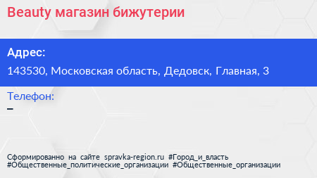 Beauty, магазин бижутерии по адресу 143530, Московская область, Дедовск, Главная, 3 в дальнейшем Организация, размещена в следующих категориях: