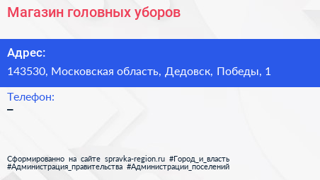 Магазин головных уборов по адресу 143530, Московская область, Дедовск, Победы, 1 в дальнейшем Организация, размещена в следующих категориях: