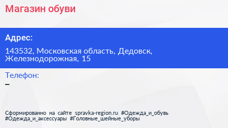 Магазин обуви по адресу 143532, Московская область, Дедовск, Железнодорожная, 15 в дальнейшем Организация, размещена в следующих категориях: