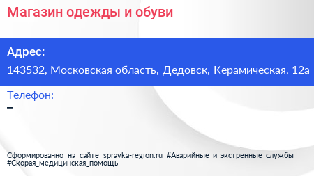 Магазин одежды и обуви по адресу 143532, Московская область, Дедовск, Керамическая, 12а в дальнейшем Организация, размещена в следующих категориях: