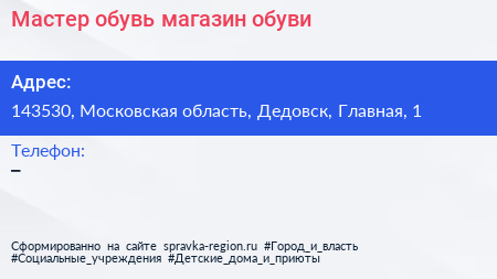 Мастер обувь, магазин обуви по адресу 143530, Московская область, Дедовск, Главная, 1 в дальнейшем Организация, размещена в следующих категориях: