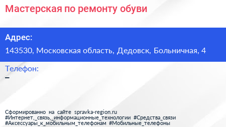 Мастерская по ремонту обуви по адресу 143530, Московская область, Дедовск, Больничная, 4 в дальнейшем Организация, размещена в следующих категориях: