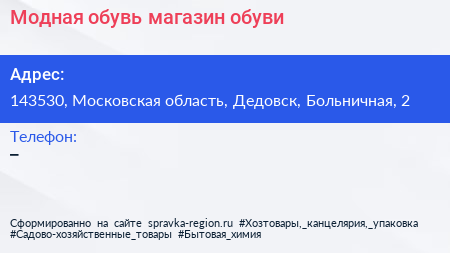 Модная обувь, магазин обуви по адресу 143530, Московская область, Дедовск, Больничная, 2 в дальнейшем Организация, размещена в следующих категориях:
