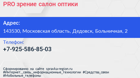 PRO зрение, салон оптики по адресу 143530, Московская область, Дедовск, Больничная, 2 в дальнейшем Организация, размещена в следующих категориях: