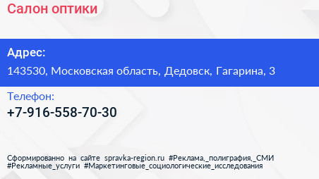 Салон оптики по адресу 143530, Московская область, Дедовск, Гагарина, 3 в дальнейшем Организация, размещена в следующих категориях: