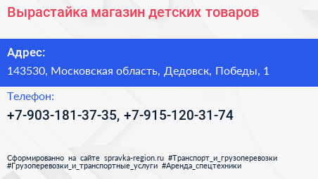 Вырастайка, магазин детских товаров по адресу 143530, Московская область, Дедовск, Победы, 1 в дальнейшем Организация, размещена в следующих категориях: