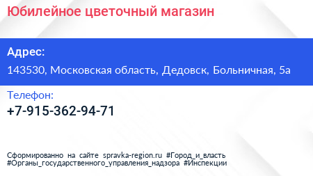 Юбилейное, цветочный магазин по адресу 143530, Московская область, Дедовск, Больничная, 5а в дальнейшем Организация, размещена в следующих категориях: