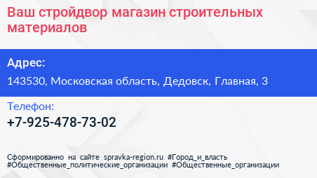 Ваш стройдвор, магазин строительных материалов по адресу 143530, Московская область, Дедовск, Главная, 3 в дальнейшем Организация, размещена в следующих категориях: