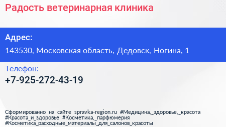 Радость, ветеринарная клиника по адресу 143530, Московская область, Дедовск, Ногина, 1 в дальнейшем Организация, размещена в следующих категориях: