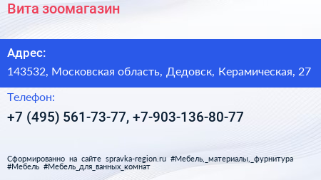 Вита, зоомагазин по адресу 143532, Московская область, Дедовск, Керамическая, 27 в дальнейшем Организация, размещена в следующих категориях: