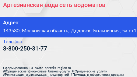 Артезианская вода, сеть водоматов по адресу 143530, Московская область, Дедовск, Больничная, 5а ст1 в дальнейшем Организация, размещена в следующих категориях: