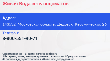 Живая Вода, сеть водоматов по адресу 143532, Московская область, Дедовск, Керамическая, 26 в дальнейшем Организация, размещена в следующих категориях: