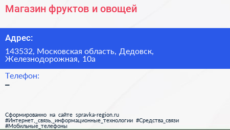 Магазин фруктов и овощей по адресу 143532, Московская область, Дедовск, Железнодорожная, 10а в дальнейшем Организация, размещена в следующих категориях: