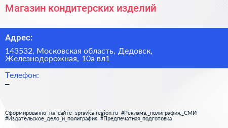Магазин кондитерских изделий по адресу 143532, Московская область, Дедовск, Железнодорожная, 10а вл1 в дальнейшем Организация, размещена в следующих категориях: