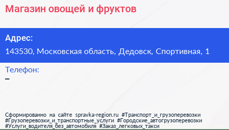 Магазин овощей и фруктов по адресу 143530, Московская область, Дедовск, Спортивная, 1 в дальнейшем Организация, размещена в следующих категориях: