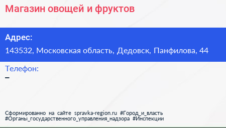 Магазин овощей и фруктов по адресу 143532, Московская область, Дедовск, Панфилова, 44 в дальнейшем Организация, размещена в следующих категориях: