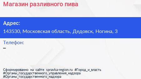 Магазин разливного пива по адресу 143530, Московская область, Дедовск, Ногина, 3 в дальнейшем Организация, размещена в следующих категориях: