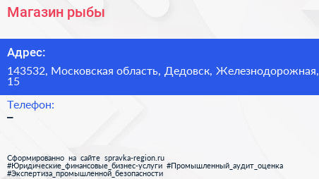 Магазин рыбы по адресу 143532, Московская область, Дедовск, Железнодорожная, 15 в дальнейшем Организация, размещена в следующих категориях: