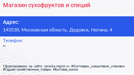 Магазин сухофруктов и специй по адресу 143530, Московская область, Дедовск, Ногина, 4 в дальнейшем Организация, размещена в следующих категориях: