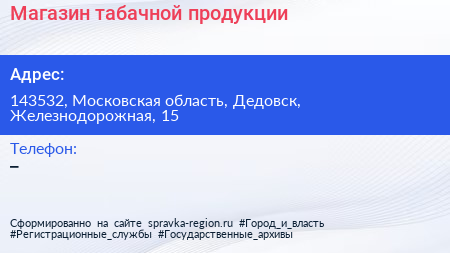 Магазин табачной продукции по адресу 143532, Московская область, Дедовск, Железнодорожная, 15 в дальнейшем Организация, размещена в следующих категориях:
