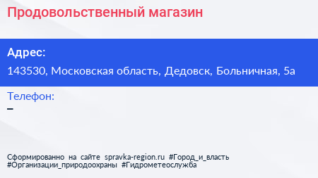 Продовольственный магазин по адресу 143530, Московская область, Дедовск, Больничная, 5а в дальнейшем Организация, размещена в следующих категориях: