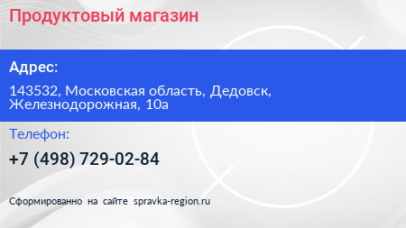 Продуктовый магазин по адресу 143532, Московская область, Дедовск, Железнодорожная, 10а в дальнейшем Организация, размещена в следующих категориях: