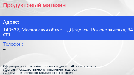 Продуктовый магазин по адресу 143532, Московская область, Дедовск, Волоколамская, 94 ст1 в дальнейшем Организация, размещена в следующих категориях: