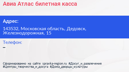 Авиа-Атлас, билетная касса по адресу 143532, Московская область, Дедовск, Железнодорожная, 15 в дальнейшем Организация, размещена в следующих категориях:
