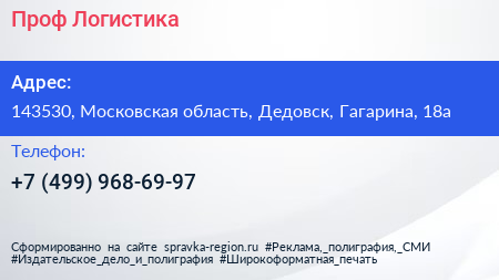Проф-Логистика по адресу 143530, Московская область, Дедовск, Гагарина, 18а в дальнейшем Организация, размещена в следующих категориях: