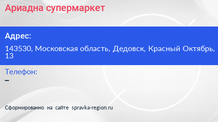 Ариадна, супермаркет по адресу 143530, Московская область, Дедовск, Красный Октябрь, 13 в дальнейшем Организация, размещена в следующих категориях: