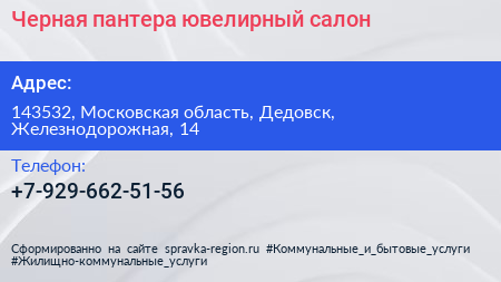 Черная пантера, ювелирный салон по адресу 143532, Московская область, Дедовск, Железнодорожная, 14 в дальнейшем Организация, размещена в следующих категориях:
