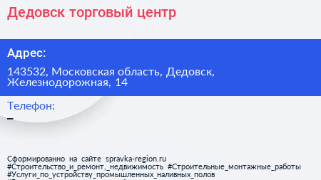 Дедовск, торговый центр по адресу 143532, Московская область, Дедовск, Железнодорожная, 14 в дальнейшем Организация, размещена в следующих категориях: