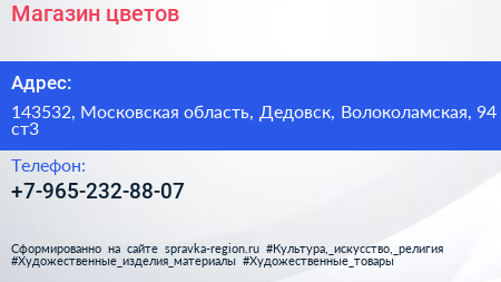 Магазин цветов по адресу 143532, Московская область, Дедовск, Волоколамская, 94 ст3 в дальнейшем Организация, размещена в следующих категориях: