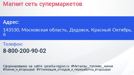 Магнит, сеть супермаркетов по адресу 143530, Московская область, Дедовск, Красный Октябрь, 6 в дальнейшем Организация, размещена в следующих категориях: