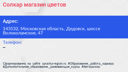 Солкар, магазин цветов по адресу 143532, Московская область, Дедовск, шоссе Волоколамское, 47 в дальнейшем Организация, размещена в следующих категориях: